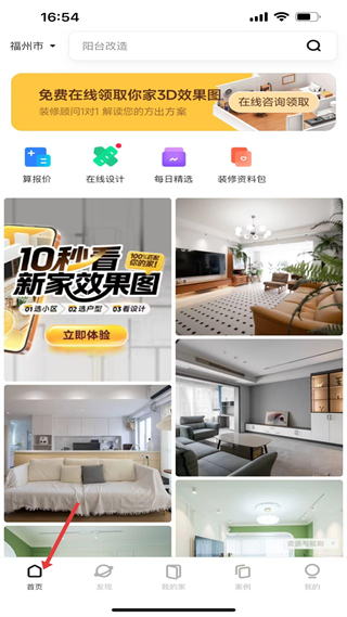 1、首頁有算報價、在線設計功能,可領3D效果圖,還有10秒看新家效果圖入口,展示多款裝修案例參考。