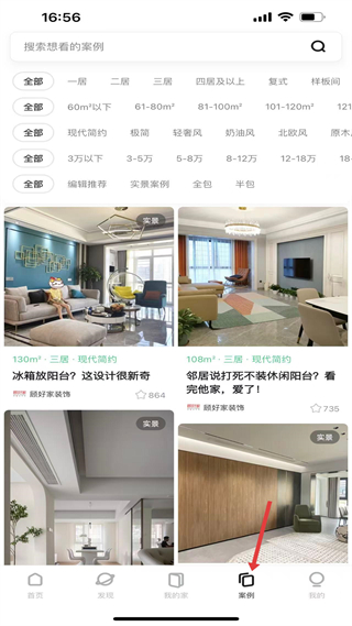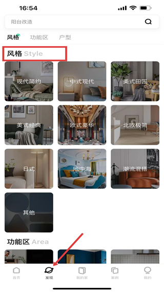 2、發現頁風格分類多,有現代簡約、中式現代等,還有功能區、戶型分類,幫用戶篩選裝修風格靈感。