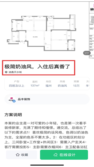 4、 案例詳情頁,極簡奶油風案例,137、預算13萬,含戶型圖、方案說明,可收藏或在線設計。