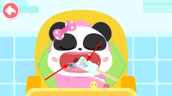 1、操作工具清潔熊貓寶寶的口腔,擦拭口腔內的臟污區域,完成口腔清潔步驟,讓熊貓保持整潔的狀態。