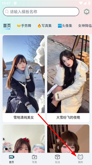 1、進入應用首頁,可見手勢舞寫真集等分類欄,展示各類模板內容,底部設首頁寫真等導航欄,點擊我的按鈕,進入個人中心界面。