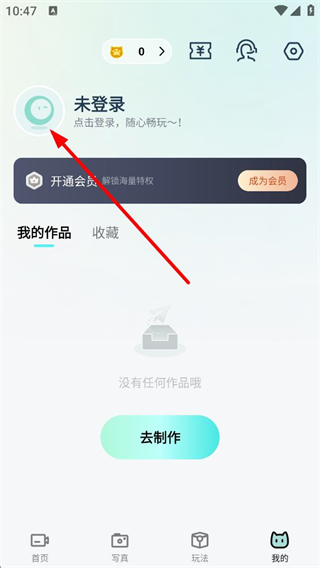 2、個人中心界面,顯示未登錄提示,還有我的作品收藏等板塊,點擊未登錄區域,進入登錄相關的操作頁面。