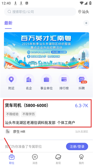 2、職位板塊可搜職位公司,定位汕頭,展示招聘活動及附近、名企等分類,還有貨車司機等具體職位信息。