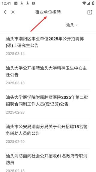 3、事業單位招聘板塊聚焦汕頭,展示多條招聘公告,如潮陽區事業單位招博碩士研究生等,方便用戶獲取信息。