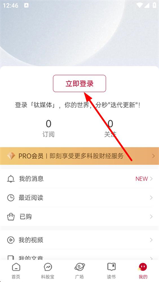 2、我的頁面點擊立即登錄,可進入登錄流程,頁面還包含訂閱關注等功能入口,以及我的消息最近閱讀等個人相關內容。