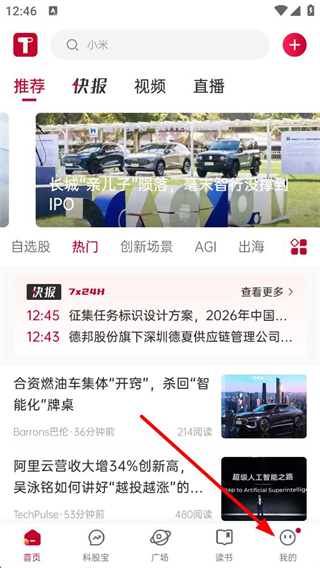 1、進入首頁可瀏覽推薦資訊,包括財經科技等領域內容,通過頂部搜索欄查找信息,底部導航可切換至科股寶廣場等功能板塊。