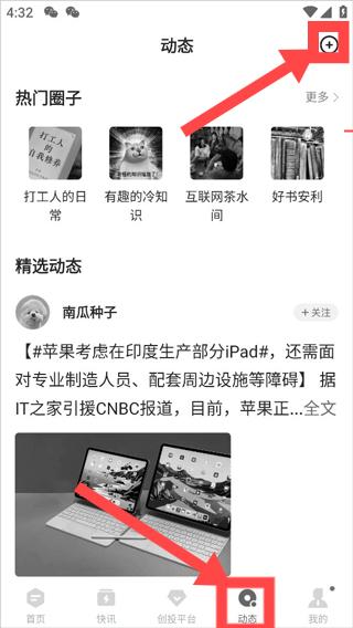 1、動態頁面,頂部有熱門圈子如打工人的日常等,方是精選動態展示資訊,右上角有加號可發布內容,底部導航欄動態入口清晰。