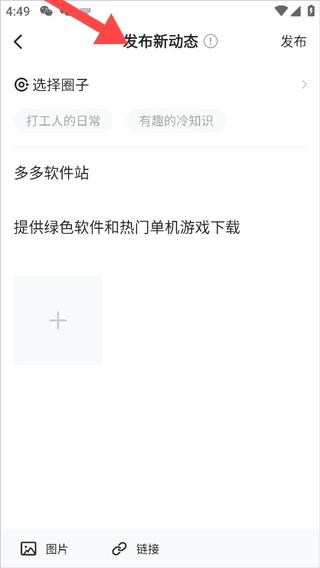 3、發布新動態界面,可選擇發布到打工人的日常等圈子,有文本輸入框用于編輯內容,還能添加圖片、鏈接,方便用戶分享觀點、資訊等。