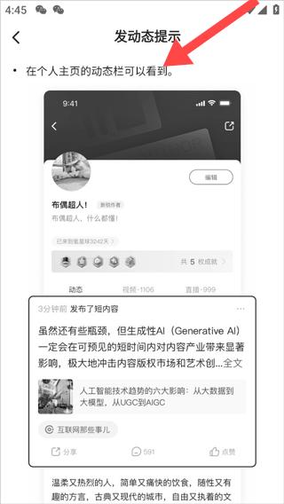 2、發動態提示界面,告知用戶在個人主頁動態欄可查看發布內容,展示了他人發布的動態示例,幫助用戶了解動態展示形式,引導用戶進行內容發布與互動。