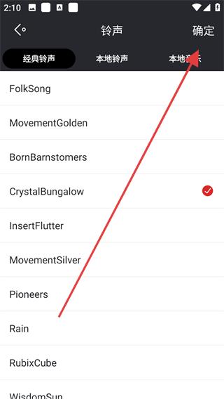 2、進入鈴聲選擇頁面,瀏覽經典鈴聲、本地鈴聲等分類,選擇CrystalBungalow等鈴聲,點擊確定,完成鬧鐘鈴聲的設置。