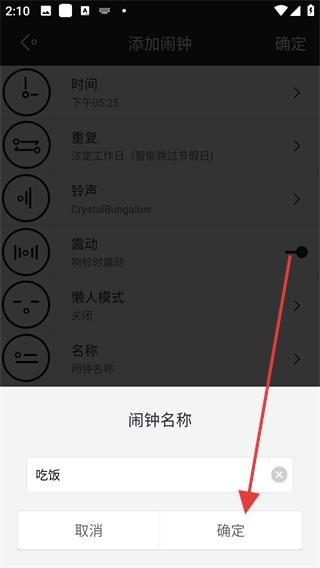 3、設置鬧鐘名稱輸入吃飯等名稱,點擊確定,完成鬧鐘名稱的設置,以便區分不同鬧鐘用途。