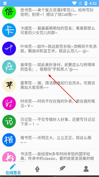 1、進入簽名選擇頁面,瀏覽各類簽名樣式比如信卡葉等,查看對應簽名的描述內容,挑選符合自身喜好的簽名風格,為后續定制做準備。