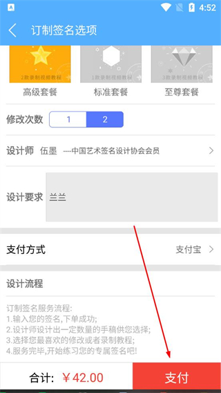 4、確認訂制簽名的各項信息后,選擇支付方式,查看設計流程,確認合計金額無誤,點擊支付按鈕完成費用支付,等待簽名設計完成。