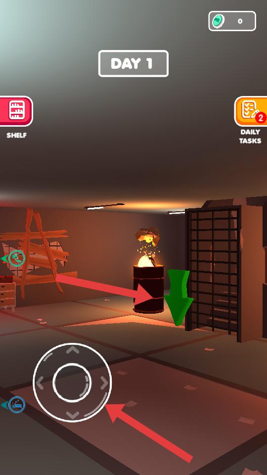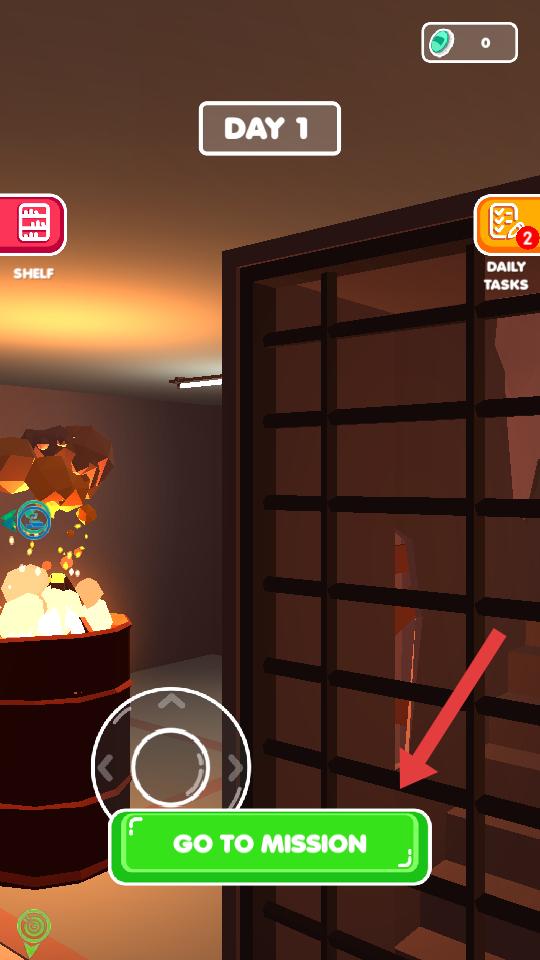 1、進入游戲,看到DAY1界面,有SHELF,DAILY TASKS等功能按鈕,通過下方操作盤,控制角色在場景里移動。