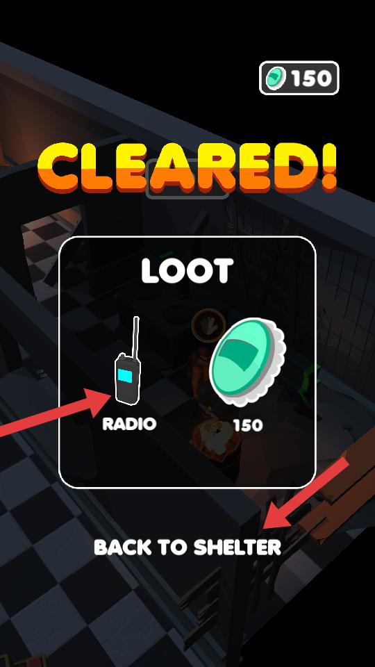 4、成功完成任務后,會顯示CLEARED界面,獲得RADIO等戰利品和貨幣獎勵,點擊BACK TO SHELTER返回庇護所。