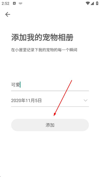 4、在添加我的寵物相冊頁面,填寫寵物的名字和出生日期,點擊添加可創建寵物的成長相冊,記錄寵物的每一個成長瞬間。