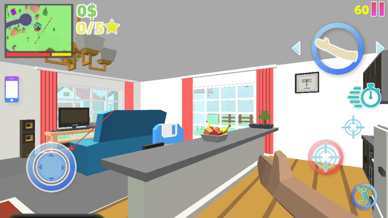 3、進入室內場景,利用左側虛擬搖桿操控角色移動,右側按鈕可使用技能、互動等,在房間探索完成任務。