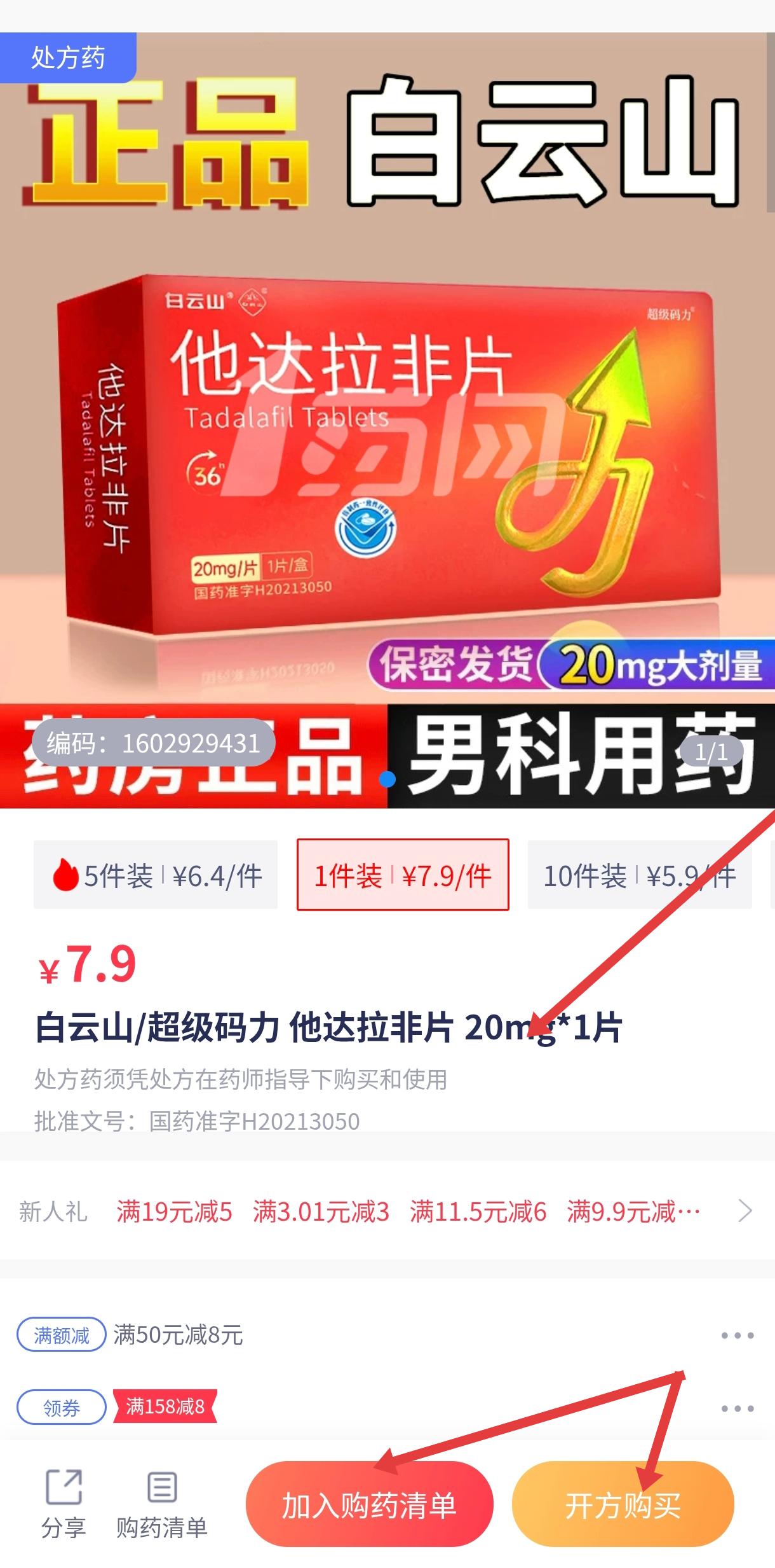 3、藥品詳情頁信息全面白云山他達拉非片規格與價格清晰,新人禮與滿減活動標注,加入購藥清單和開方購買按鈕突出,幫助用戶便捷下單處方藥。