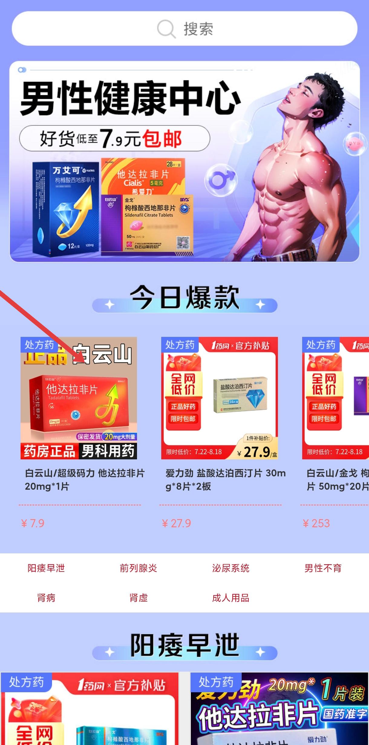 2、男科用藥頁面聚焦男性健康好貨低至個位數包郵,今日爆款藥品陳列,白云山他達拉非片等展示,陽痿早泄等分類明確。