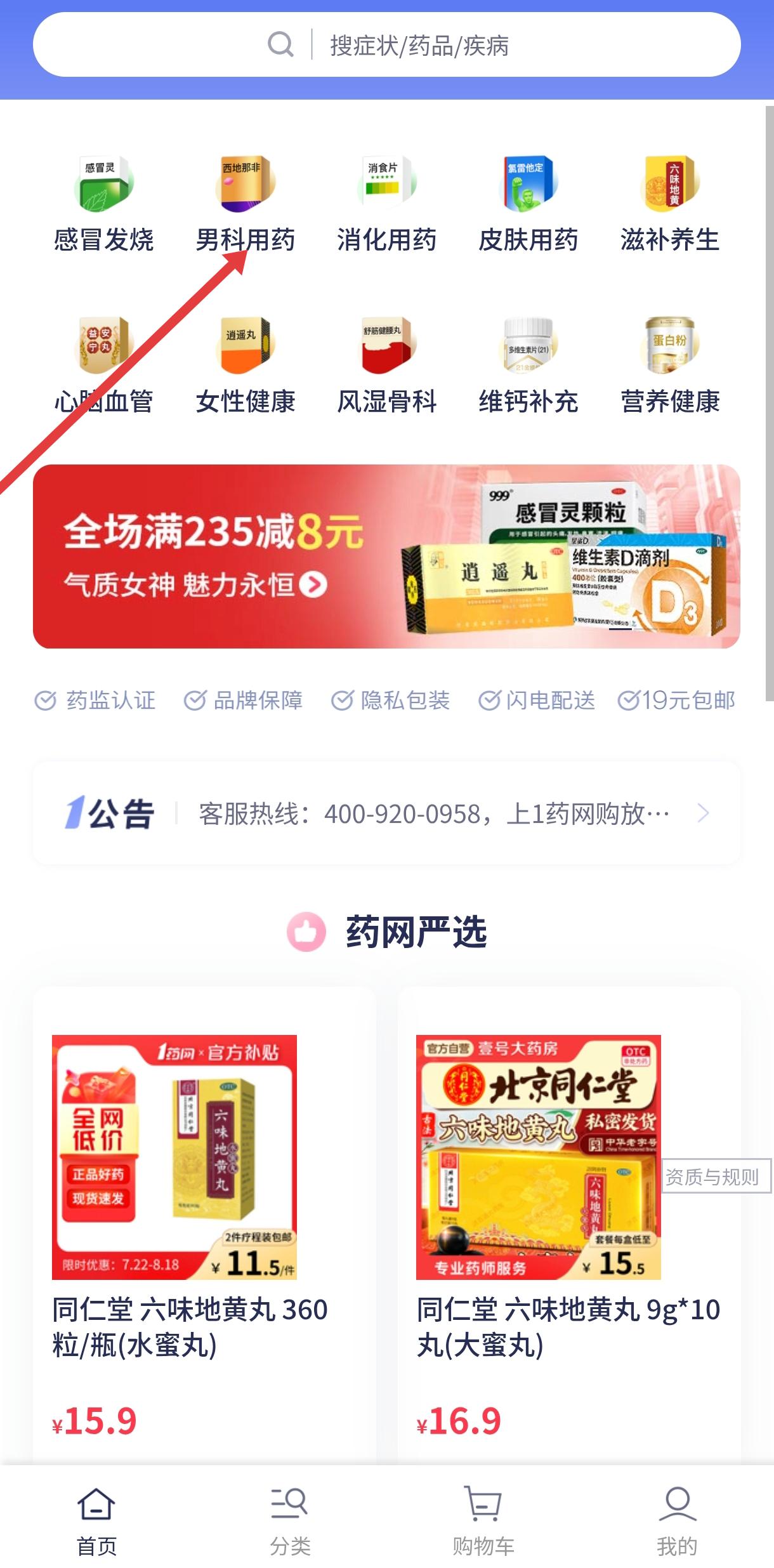 1、首頁分類清晰男科用藥等板塊羅列,全場滿減活動醒目,藥網嚴選商品陳列,同仁堂六味地黃丸等展示,藥監認證等保障。