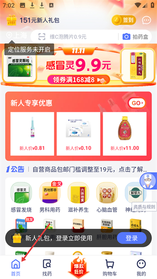 1、首頁有151元新人禮包,展示感冒靈9.9元等促銷,設新人專享優惠區,還有感冒發燒、男科用藥等分類可登錄用新人禮包。