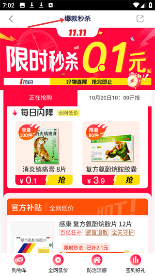 2、爆款秒殺頁11.11限時秒殺0.1元起,有消炎鎮痛膏、復方氨酚烷胺膠囊等搶購,還有官方補貼的感康復方氨酚烷胺片等。