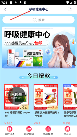 3、呼吸健康中心頁999感冒靈低至9.9元包郵,展示今日爆款,如999感冒靈顆粒部分售罄、感康復方氨酚烷胺片等。