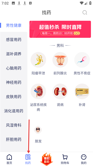 4、找藥頁有超值秒殺,左側分男性健康、感冒用藥等類,右側男科板塊含陽痿早泄、前列腺炎等病癥相關用藥分類。