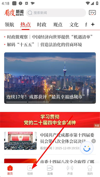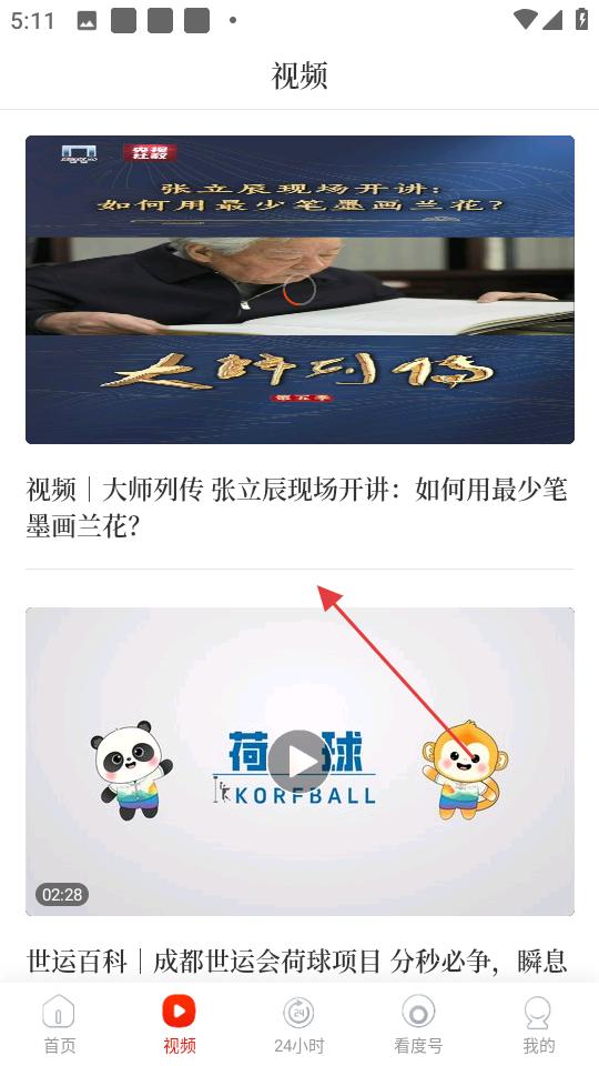 1、開啟看度APP,點擊底部視頻按鈕進入視頻頁面,視頻資訊,遇感興趣視頻標題,輕觸即可開啟觀看,深入了解多元時事動態,不錯過精彩內容。