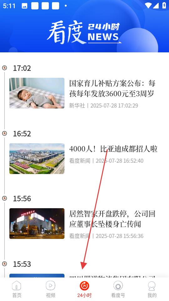 2、若需掌握實時資訊,返回底部導航欄點擊24小時,跳轉頁面后滾動查看不同時間發布的新聞,快速知曉最新發生的各類事件信息。