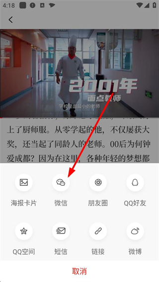 4、彈出的分享選項中,選擇微信對應的選項,即可將該微紀錄片內容分享至微信平臺的聯系人或相關區域。