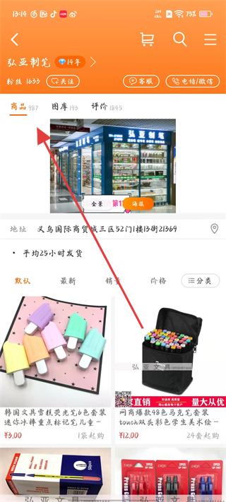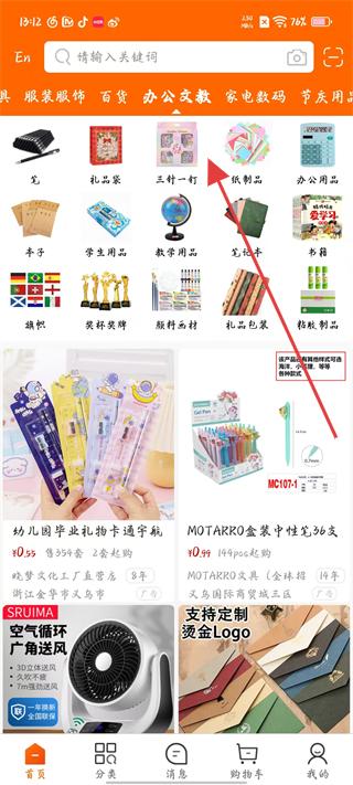 1、進入軟件可在分類板塊選擇辦公文教等分類,找到飲制品、辦公用品等細分品類,也可進入店鋪頁面查看商品、圖庫、評價等信息