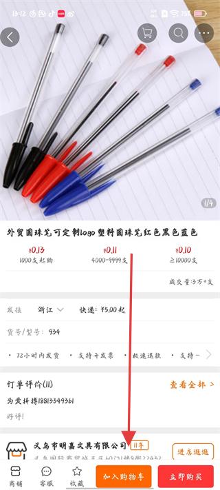 4、選擇外貿圓珠筆等商品查看商品價格、發貨地等信息,點擊加入購物車或立即購買,完成文具的購買。