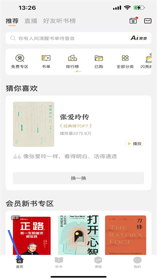 1、進入首頁,可見猜你喜歡板塊展示張愛玲傳等書籍,標注了播放量,還有免費專區等功能入口,可點擊播放推薦書籍內容。