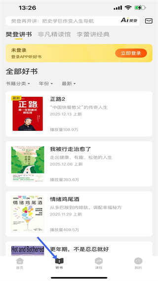 2、切換到聽書界面,有樊登講書等分類,展示正路2等最新上架書籍,標注了上架時間與播放量,可查看書籍詳細信息。