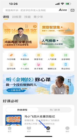 3、切換到課程界面,有今日特惠等課程分類,涵蓋國學經典等領域,還有好課必聽板塊展示熱銷課程,可查看課程詳情。