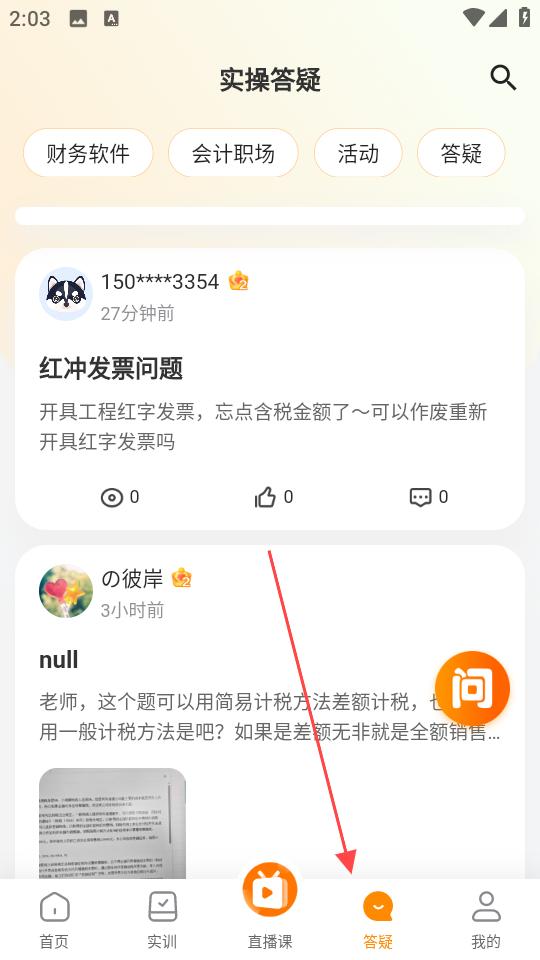 3、實操答疑界面,有財務軟件、會計職場等分類標簽,展示了用戶提出的紅沖發票等問題,方便會計從業者交流和解決實操問題。
