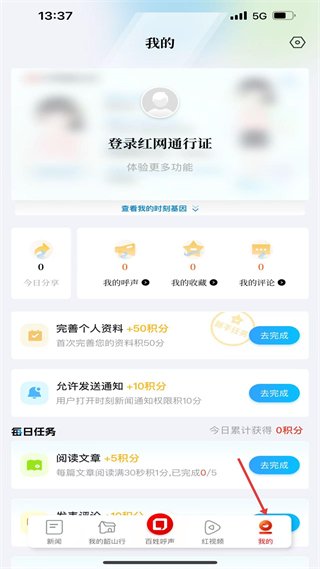 4、用戶個人中心,支持登錄紅網通行證,含分享收藏功能,可完成任務積積分,是管理賬號與權限的入口。