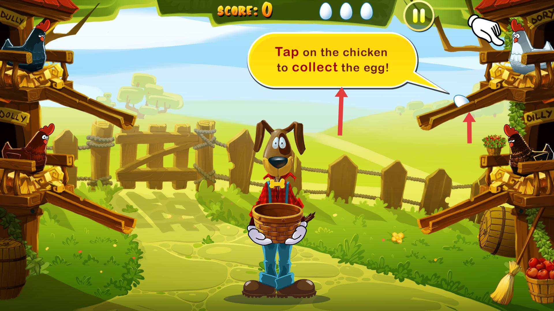 2、進入游戲后,按提示點擊雞,可收集雞蛋,角色手持籃子,點擊雞后雞蛋會落入籃子,通過點擊雞來積累雞蛋,提升得分。