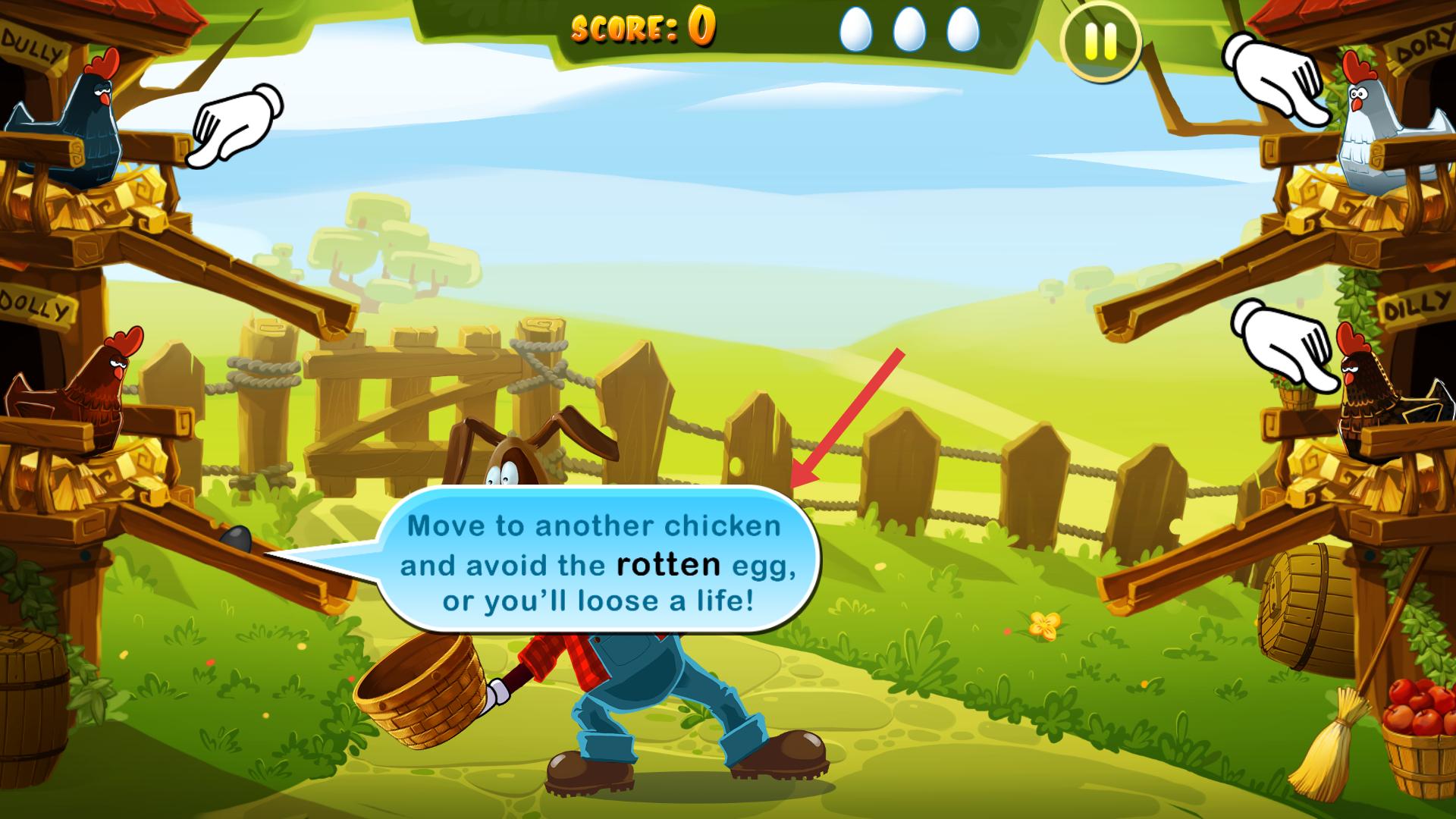 4、要避開壞雞蛋,它會讓玩家損失生命,所以需移動到其他雞那里,選擇能下好蛋的雞,避免碰到壞雞蛋,保持生命數,順利收集雞蛋。