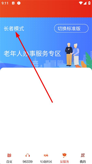 2、進入長者模式后,界面會切換為老年人辦事服務專區,適配老年群體使用習慣,也可隨時點擊切換標準版回到常規界面。