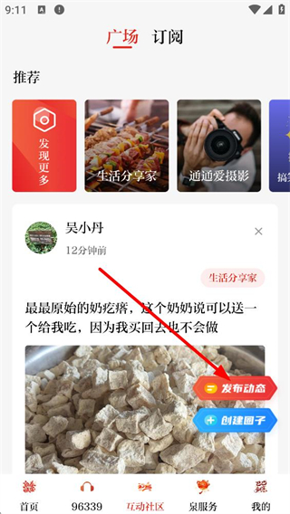3、互動社區的廣場頁面,可瀏覽推薦的生活分享內容,也能點擊發布動態按鈕,分享個人生活相關的信息或內容。