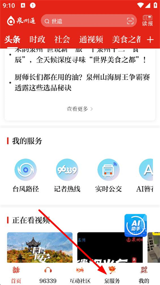 1、泉州通首頁點擊泉服務,可進入掌上政務與便民服務平臺,這里提供市民碼政策集等服務,還能切換到長者模式。