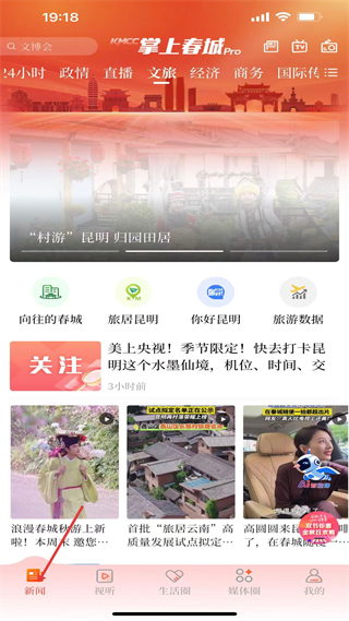 1、新聞板塊有24小時等頻道,展示村游昆明等文旅資訊,設向往的春城等入口,支持新聞搜索。