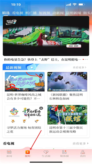 2、視聽板塊有看電視等分類,展示昆明咖啡風尚之城、石林秋色等視頻,支持查看更多最新視頻。