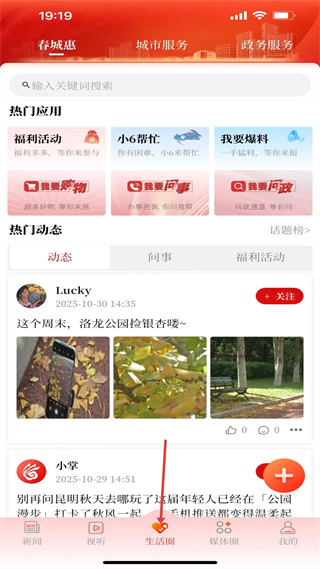 3、生活圈板塊有春城惠等分類,設福利活動等熱門應用,展示洛龍公園撿銀杏等動態,支持話題互動。