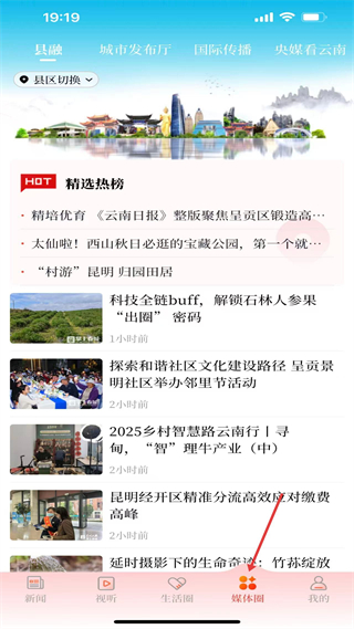 4、媒體圈板塊有縣融等分類,展示石林人參果出圈、呈貢社區鄰里節等資訊,設精選熱榜,呈現多元內容。