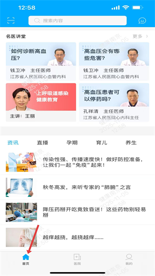 1、首頁有名醫講堂和資訊板塊,涵蓋高血壓、上呼吸道感染等健康知識,還有多分類資訊,助力用戶獲取專業健康信息。