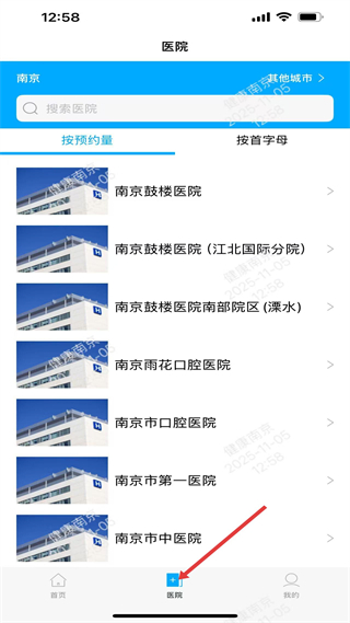 2、醫院頁可搜索南京及其他城市醫院,按預約量或首字母展示南京鼓樓醫院等多家醫院,方便用戶精準查找就醫資源。