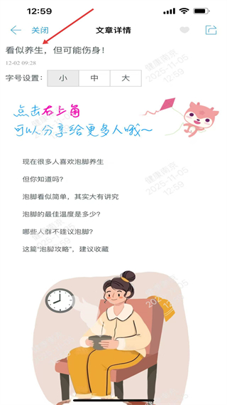 3、文章詳情頁展示養生類文章,支持字號設置,內容詳細且實用,助力用戶深入且全面地了解正確養生方法。